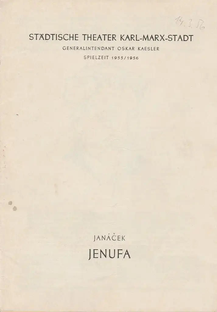 Städtische Theater Karl-Marx-Stadt, Oskar Kaesler, Wolf Ebermann, Bernhard Schröter: Programmheft Leos Janacek JENUFA oder IHRE ZIEHTOCHTER Spielzeit 1955 / 56.