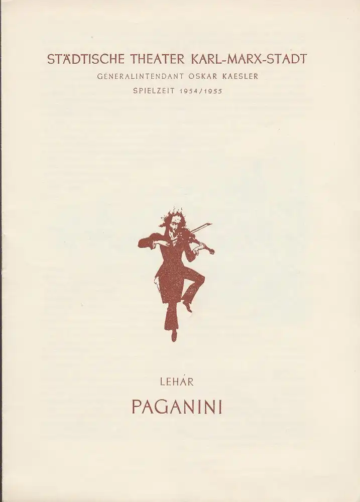 Städtische Theater Karl-Marx-Stadt, Oskar Kaesler, Wolf Ebermann, Burkart Hernmarck, Renate Müller, Margarete Gaitzsch: Programmheft Franz Lehar PAGANINI Spielzeit 1954 / 55.
