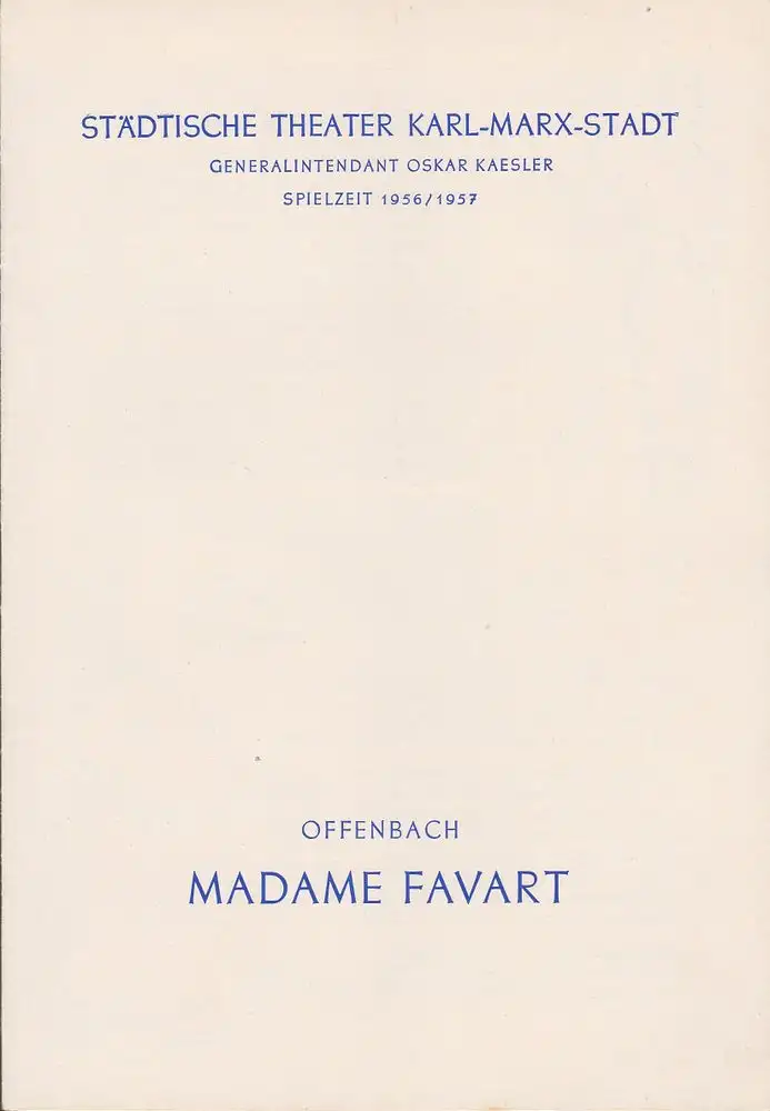 Städtische Theater Karl-Marx-Stadt, Oskar Kaesler, Wolf Ebermann: Programmheft Jacques Offenbach MADAME FAVART Premiere 13. Januar 1957 Spielzeit 1956 / 1957.