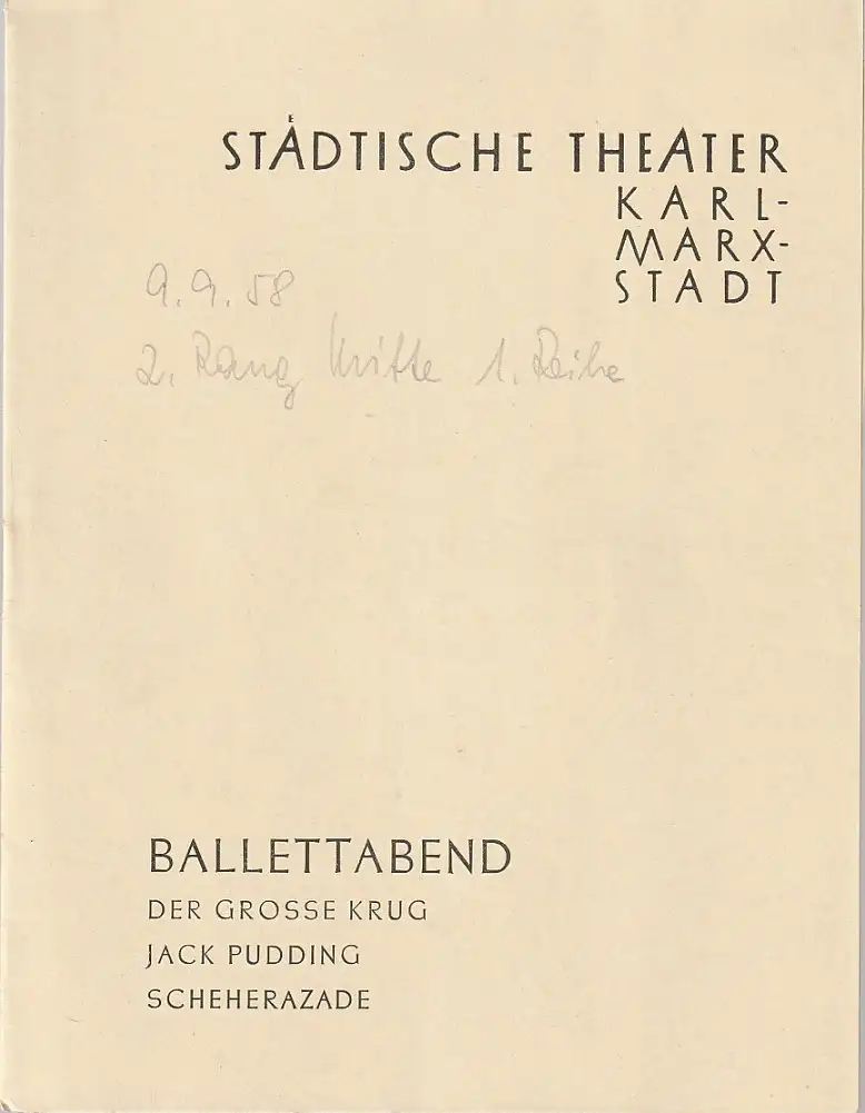 Choreographie: Inge Ziegler. Musikalische Leitung: Siegfried Franze. Bühne: Willi Eylitz. Kostüme: Renate Müller. DER GROSSE KRUG: Ballett Komödie von Alfredo Casella. Mitwirkende: Hinrich Köhn, Inge Richter, Heinz Kretzschmann, Wolfgang Baumann, Zita Bergmann, Renate Bitterlich, u. a. JACK PUDDING: Ballett in drei Bildern von Hans Werner Henze. Erstaufführung für die DDR. Mitwirkende: Heinz Kretzschmann, Renate Bitterlich, Gisela Walther, Bruno Gahler, Helga Tränkner, u. a. SCHEHERAZADE: Dramatisches Ballett von Gertrud Steinweg. Musik: Nikolai Rimsky-Korssakow. Mitwirkende: Ursula Müller, Hinrich Köhn, Bruno Gahler, Inge Richter, Heinz Kretzschmann, Christel Oehmichen, Gisela Walther, u. a. - Theaterprogramm, Opernprogramm, Ballettprogramm, Musicalprogramm, Konzertprogramm, Theatermemorabilia, Programmhefte Sammlung, deutsche Theatergeschichte.