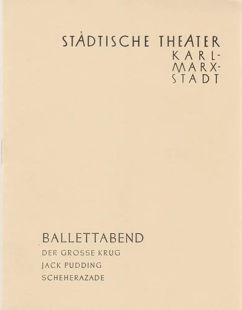 DER GROßE KRUG: Ballettkomödie von Alfredo Casella. JACK PUDDING: Ballett in drei Bildern von Hans Werner Henze. Erstaufführung in der DDR. SCHEHERAZADE: Dramatisches Ballett von Gertrud Steinweg. Musik von Nikolai Rimsky-Korssakow. Choreographie: Inge Ziegler. Musikalische Leitung: Siegfried Franze. Bühnenbild: Willi Eylitz. Kostüme: Renate Müller. Mitwirkende: Hinrich Köhn, Inge Richter, Heinz Kretzschmann, Wolfgang Baumann / Heinz Kretzschmann, Renate Bitterlich, Gisela Walther, Dieter Kraushaar / Ursula Möller, Hinrich Köhn, Bruno Gahler, Inge Richter, u. a. - Theaterprogramm, Opernprogramm, Ballettprogramm, Musicalprogramm, Konzertprogramm, Theatermemorabilia, Programmhefte Sammlung, deutsche Theatergeschichte.