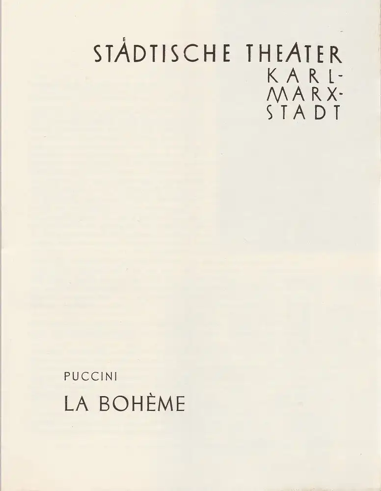 Szenen aus Henri Murgers VIE DE BOHEME von G. Giacoso und L. Illica. Unter Verwendung der deutschen Fassung von Ludwig Hartmann aus dem italienischen neu übersetzt vonCarl Riha. Musikalische Leitung: Walter Heymann. Inszenierung: Carl Riha. Bühnenbild: Jost Bednar. Kostüme: Renate Müller. Chöre: Hans Adametz. Mitwirkende: Lajos Pasztor, Alfred Krohn, Eckehard Pohl, Konrad Rupf, Rudi Hedwig, Annerose Töpfer, u. a. - Theaterprogramm, Opernprogramm, Ballettprogramm, Musicalprogramm, Konzertprogramm, Theatermemorabilia, Programmhefte Sammlung, deutsche Theatergeschichte.
