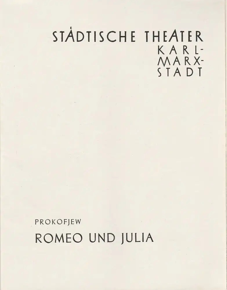 Ballett von L. M: Lawronski und Sergej Prokofjew nach dem gleichnamigen Trauerspiel von William Shakespeare. Choreographie ind Inszenierung: Inge Ziegler, Hinrich Köhn. Musikalische Leitung: Günter Blumhagen. Bühnenbild: Jost Bednar. Kostüme: Renate Müller. Mitwirkende: Werner Süß, Josef Starosta, Werner Wiesner, Siegfried Lehmann, Ronald Mooshammer, Willy Baumheier, u. a. - Theaterprogramm, Opernprogramm, Ballettprogramm, Musicalprogramm, Konzertprogramm, Theatermemorabilia, Programmhefte Sammlung, deutsche Theatergeschichte.