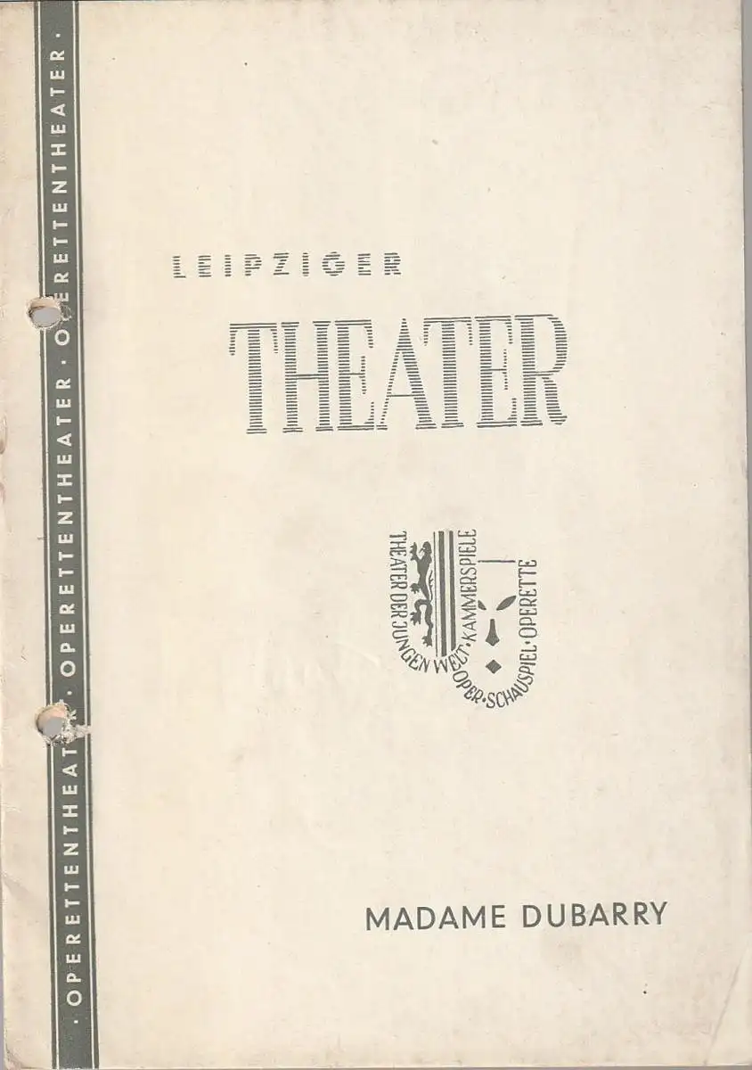 Operette. Einrichtung für das Leipziger Operttentheater von Helmut Bläss und Walther Hartmann. Regie: Helmut Bläss. Musikalische Leitung: Walther Hartmann. Tänze: Ingo Thess. Bühne: Klaus Poppitz. Kostüme: Hanna Reichelt. Mitwirkende: Edith Etsendick, Lilo Heuck, Gerd Pallesche, Hans Oswald, Otto Stübler, Paul Bresser, Walter Ofiera, u. a. - Theaterprogramm, Opernprogramm, Ballettprogramm, Musicalprogramm, Konzertprogramm, Theatermemorabilia, Programmhefte Sammlung, deutsche Theatergeschichte.
