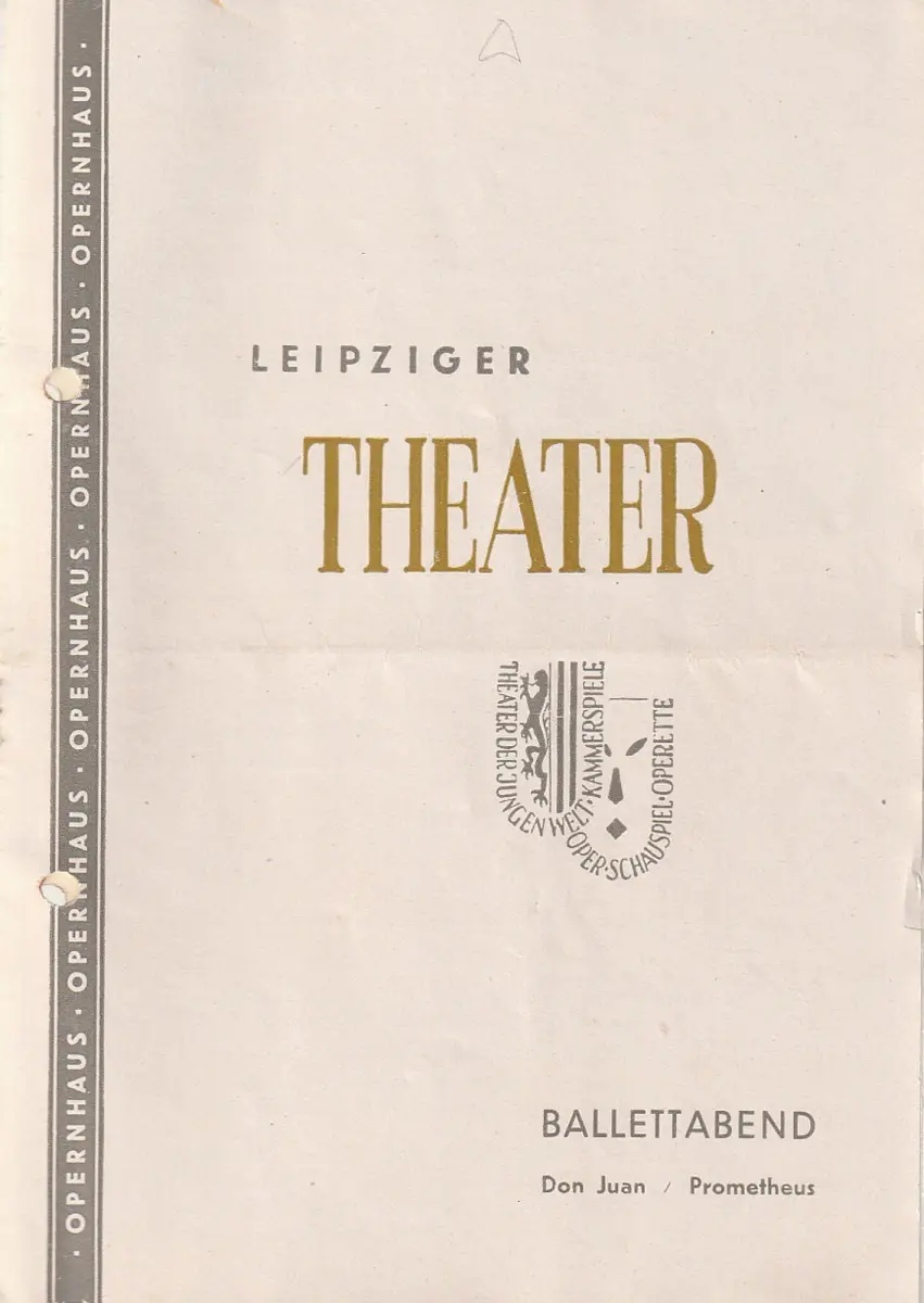 Choreographie: Lilo Gruber. Musikalische Leitung: Heinz Fricke. Bühne: Max Elten. Kostüme: Sonja Planitz-Könnecke. Programm: Christoph Willibald Gluck DON JUAN ( Das steinerne Gastmahl ). Pantomimisches Ballett in 4 Bildern. Mitwirkende: Günter Jätzlazu, Karl Maschwitz, Ursula Cain, Pedro Hebenstreit, Christine Schulze Hebenstreit, u. a. Ludwig van Beethoven DIE GESCHÖPFE DES PROMETHEUS. Ballett in einem Bild. Mitwirkende: Günter Jätzlau, Werner Wolf, Gudrun Müller, Pedro Hebenstreit, Christine Schulze-Hebenstreit, Lothar Hertel - Karl Maschwitz, u. a. - Theaterprogramm, Opernprogramm, Ballettprogramm, Musicalprogramm, Konzertprogramm, Theatermemorabilia, Programmhefte Sammlung, deutsche Theatergeschichte.