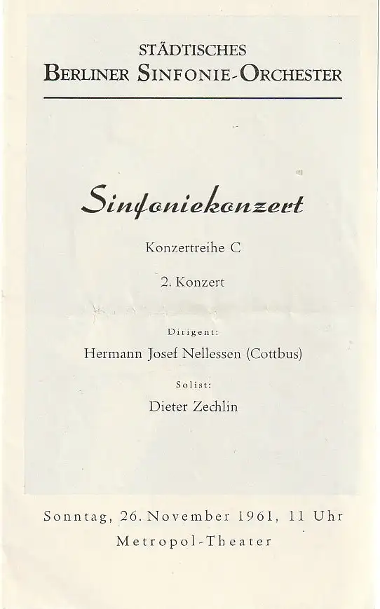 Städtisches Berliner Sinfonie-Orchester: Programmheft SINFONIEKONZERT 2. Konzert STÄDTISCHES BERLINER SINFONIE-ORCHESTER 26. November 1961 Metropol-Theater.