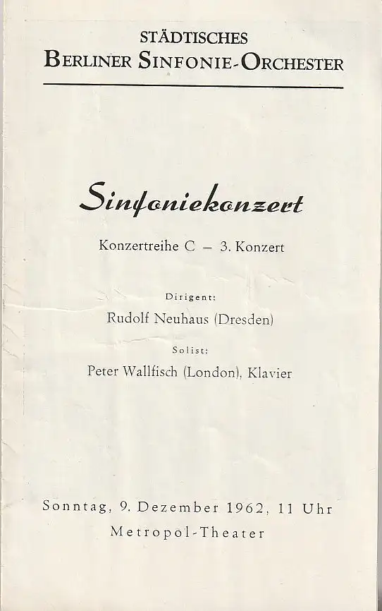 Städtisches Berliner Sinfonie-Orchester: Programmheft SINFONIEKONZERT 3. Konzert STÄDTISCHES BERLINER SINFONIE-ORCHESTER 9. Dezember 1962 Metropol Theater.