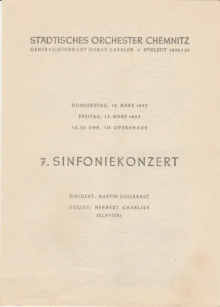 Städtisches Orchester Chemnitz, Oskar Kaesler: Programmheft 7. SINFONIEKONZERT 12. und 13. März 1953 Opernhaus Spielzeit 1952 / 53.