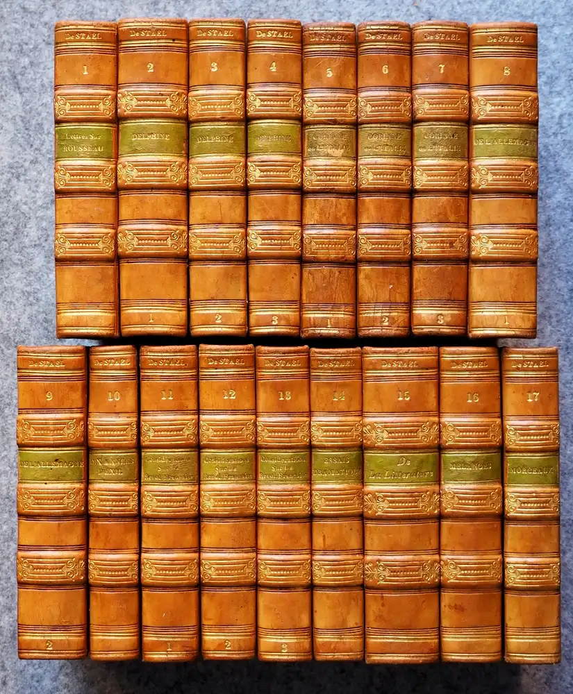 [1] Notice sur le caractère et les écrits de Mme de Staël par Mdme Necker de Saussure; suivi des lettres sur J.J. Rousseau / [2-4] Delphine, I-III / [5-7] Corinne, ou l'Italie (I-III) / [8-9] De l'Allemagne (I-II) / [10] Dix années d'exil; fragmens d'un ouvrage einédit, composé dans les années 1810 à 1813 / [11-13] Considérations sur les principaux événemens de la Révolution française, depuis son origin jusques et compris le 8 Juillet 1815 I-III / [14] Essais dramatiques / [15] De la littérature, considérée dans ses rapports avec les institutions sociales / [16] Mélanges / [17] Morceaux divers, suivis de trois nouvelles. Folgende Bände erschienen in Brüssel bei Aug. Wahlen : 5-7 (1831); 10, 14 und 16 (1821) sowie Bd. 11 (1820). Alle übrigen Bände in Paris bei Impr. Dambray, 1820. - Anne-Louise-Germaine Baronin von Staël-Holstein, geb. Necker (1766-1817), französische Schriftstellerin u. frühe Literaturwissenschaftlerin. - Jeder Band mit gestoch. Wappenexlibris mit dem Motto "Crux Christi solamen affert". - Deckelkanten etwas berieben, 1 RSch. m. kl. Schabstelle; Band 9 ohne Vortitel und Titelblatt. Wohlerhaltenes, hübsch und uniform gebundenes Exemplar