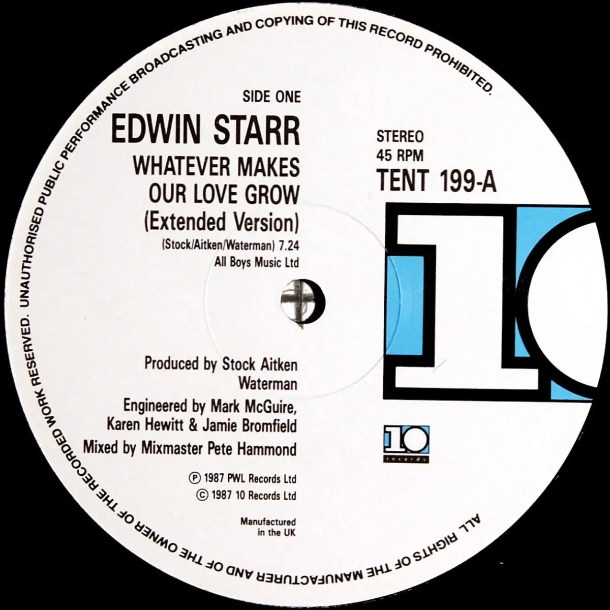 12" Maxi Edwin Starr - Whatever Makes Our Love Grow, Stock / Aitken / Waterman; neutrales Cover, Zustand Platte M- Hülle M-; Made in United Kingdom 1987 10 Records Ltd. TENT 199, Tracks Ext. Vers. 7:24, Instr. 5:09