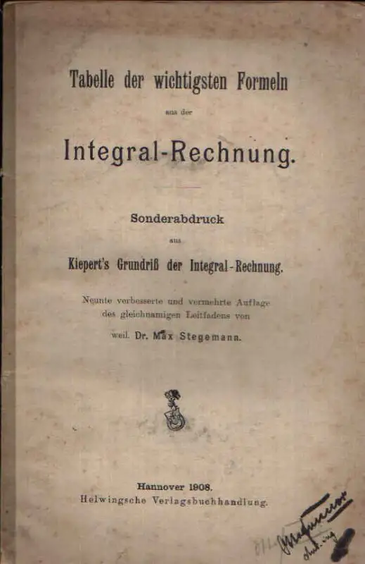 Tabellen der wichtigsten Formeln aus der Integral-Rechnung; Max Stegemann; Integral-Rechnung; Mathematik; Fachbuch; Sonderabdruck