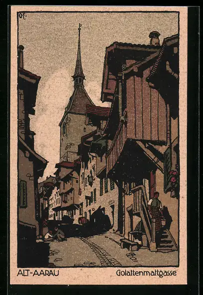 Steindruck-AK Alt-Aarau, Golattenmattgasse mit Blick zur Kirche