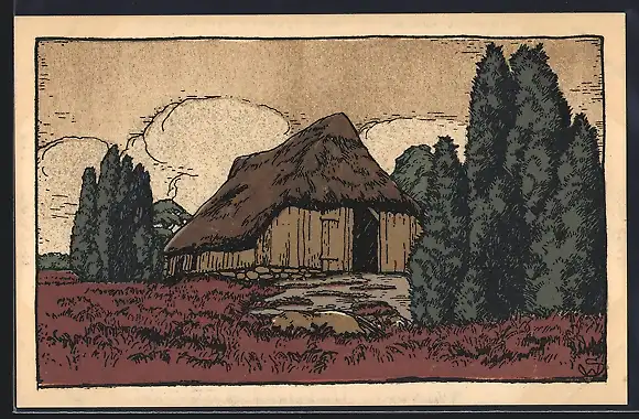Steindruck-AK Alter Schafstall in der Lüneburger Heide