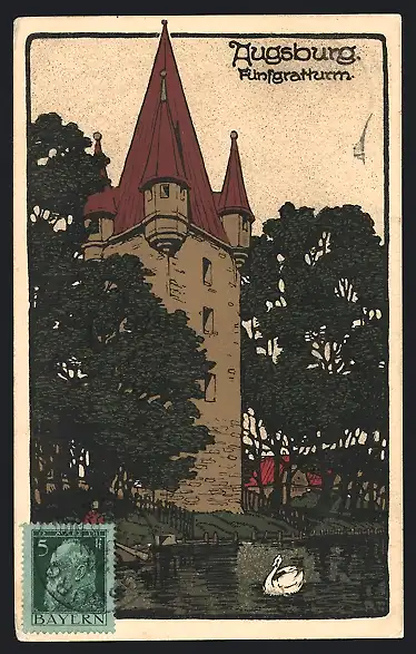 Steindruck-AK Augsburg, Blick zum Fünfgratturm, Ruderboot, Schwan