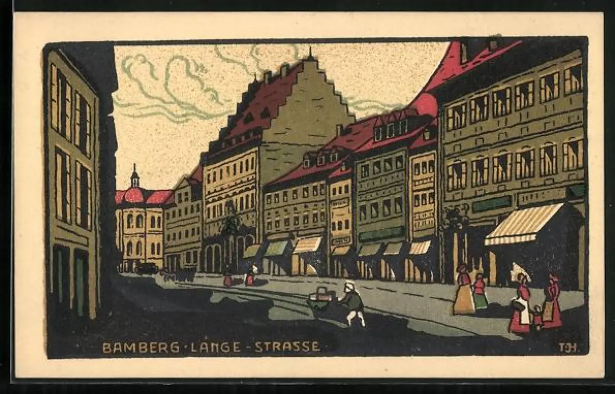 Steindruck-AK Bamberg, Lange-Strasse mit Passanten