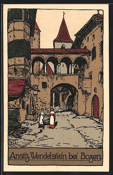 Steindruck-AK Bozen, Strassenpartie am Ansitz Wendelstein