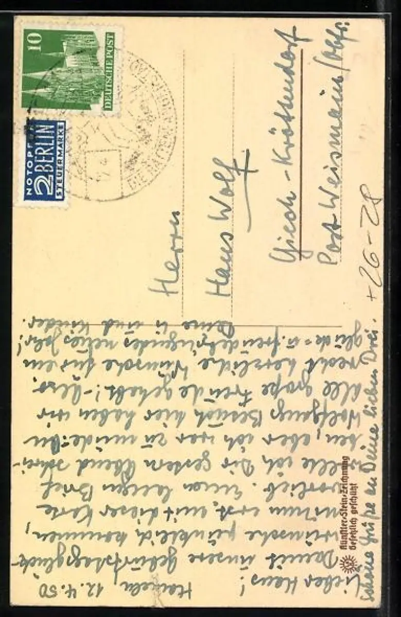 gelaufen 1950, Eckknick oben li., Einriss unten re., guter Zustand