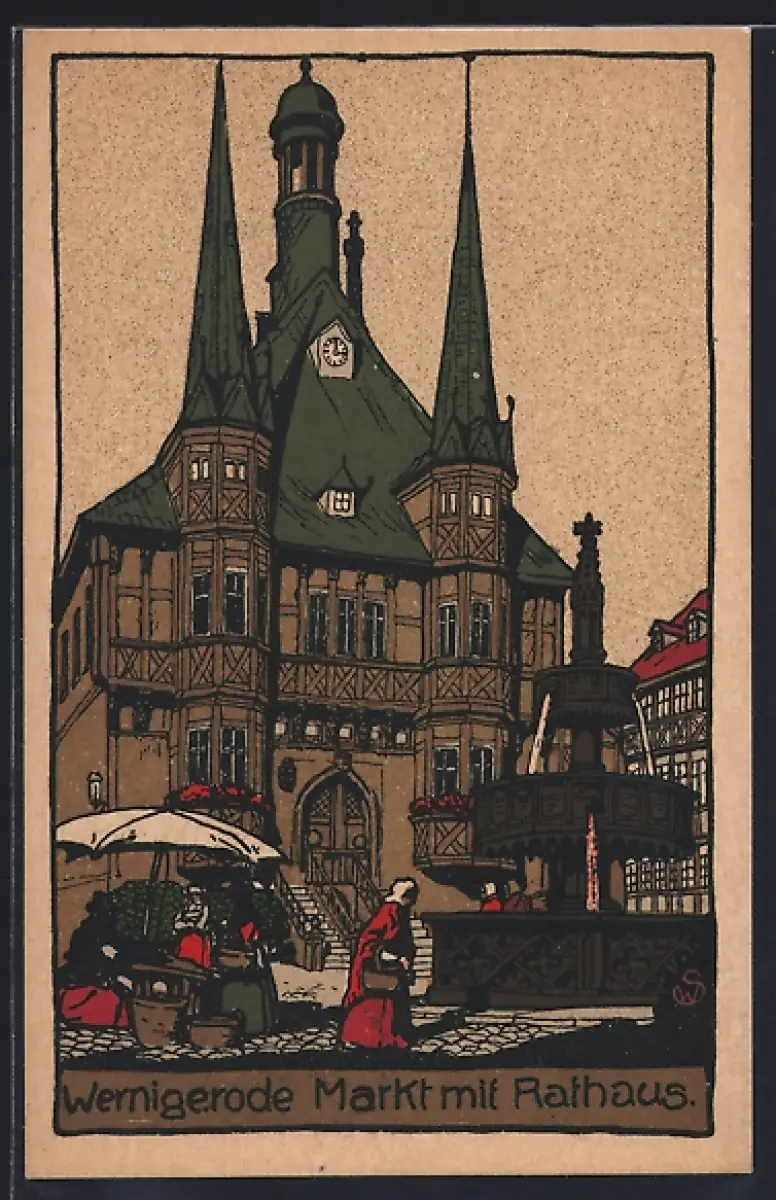 Steindruck-AK Wernigerode, Rathaus & Markt