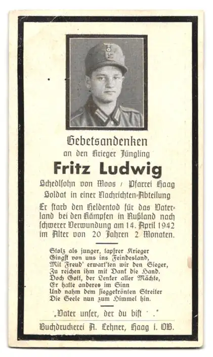 Sterbebild Fritz Ludwig, Soldat in Nachrichten-Abteilung, gefallen am 14. April 1942 nach schwerer Verwundung in Russland