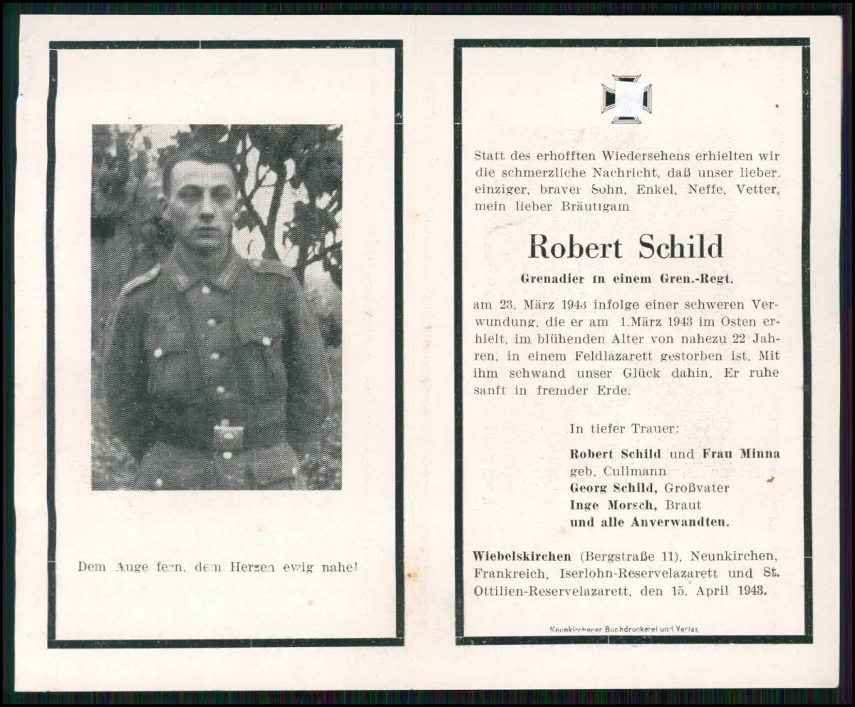 Sterbebild Robert Schild Grenadier Regt. WWII 1943 - Wiebelskirchen Neunkirchen