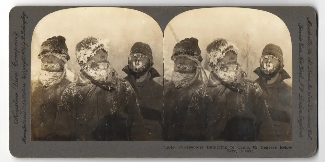 Stereo-Fotografie Keystone View Co., Meadville, Prospectors Returning to Camp at 62 Degrees Below zero, Alsaks