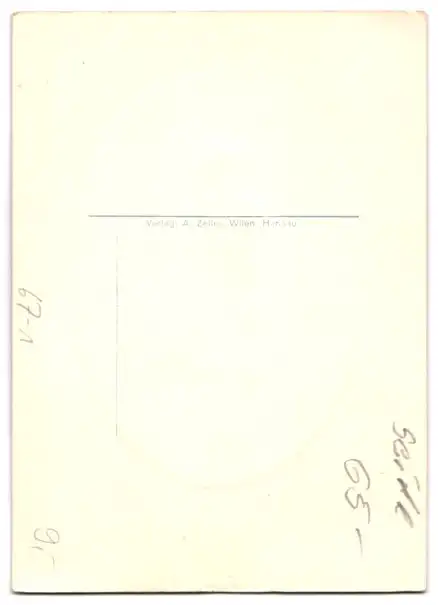 Personenbezogene Daten auf der Rückseite der Karte wurden durch blauen Textmarker unkenntlich gemacht. Die blauen Stellen sind auf die Vorderseite durchgeweicht und wirken sich negativ auf das Postkartenfoto aus
