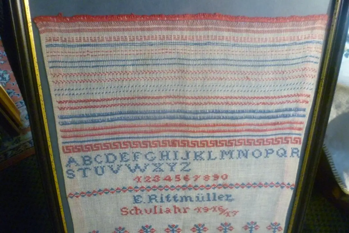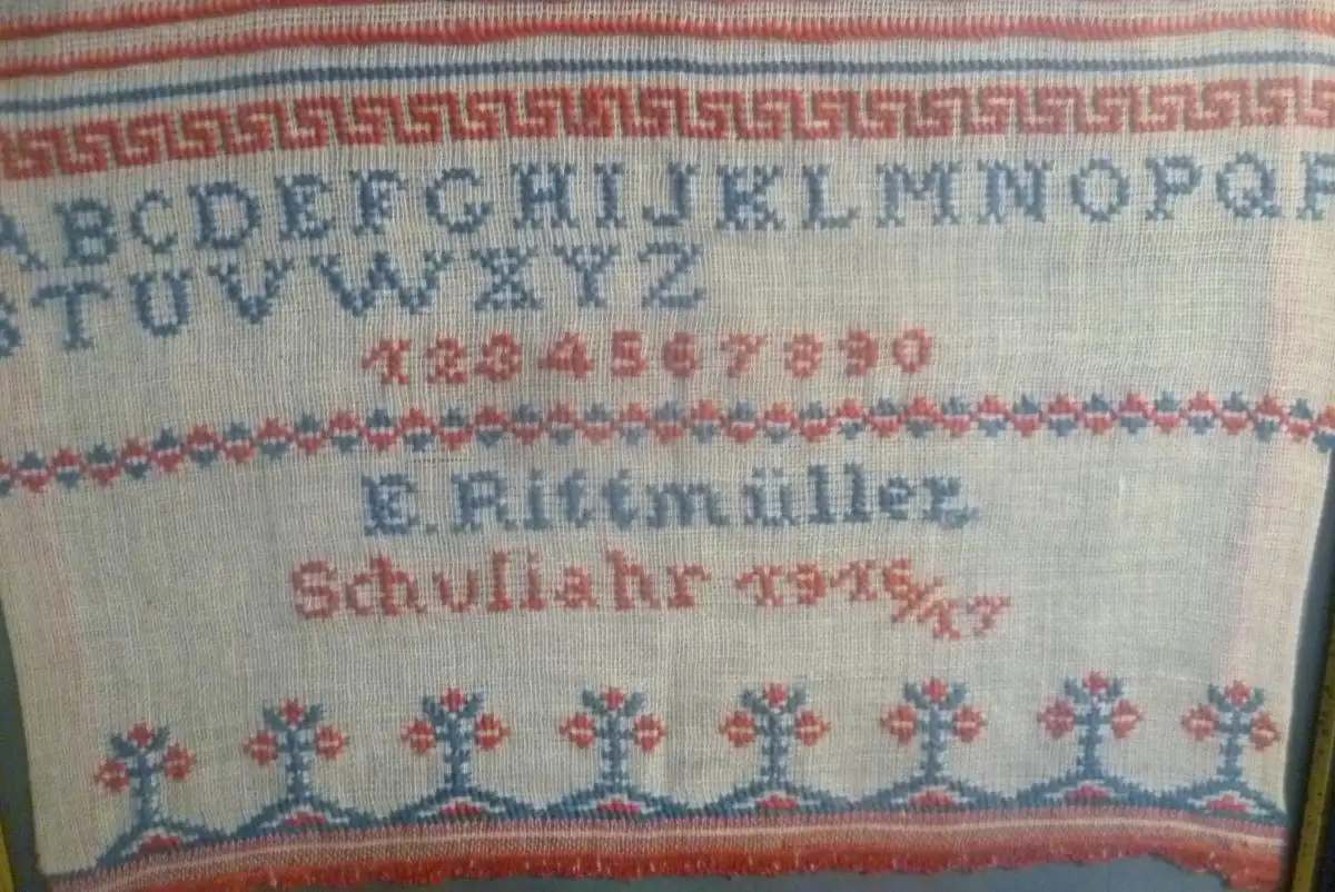 Stickmustertuch embroidered sampler Alphabet ABC Stickbild-Stickbuch Fibel bunt datiert 1916/17 signiert R. Rittmüller