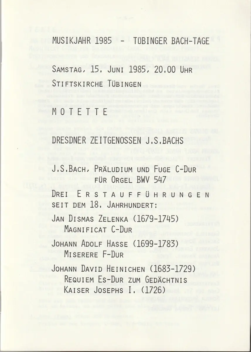 Titel: Programmheft TÜBINGER BACH-TAGE MOTETTE DRESDNER ZEITGENOSSEN J.S. BACHS 15. Juni 1985 Stiftskirche Tübingen Musikjahr 1985