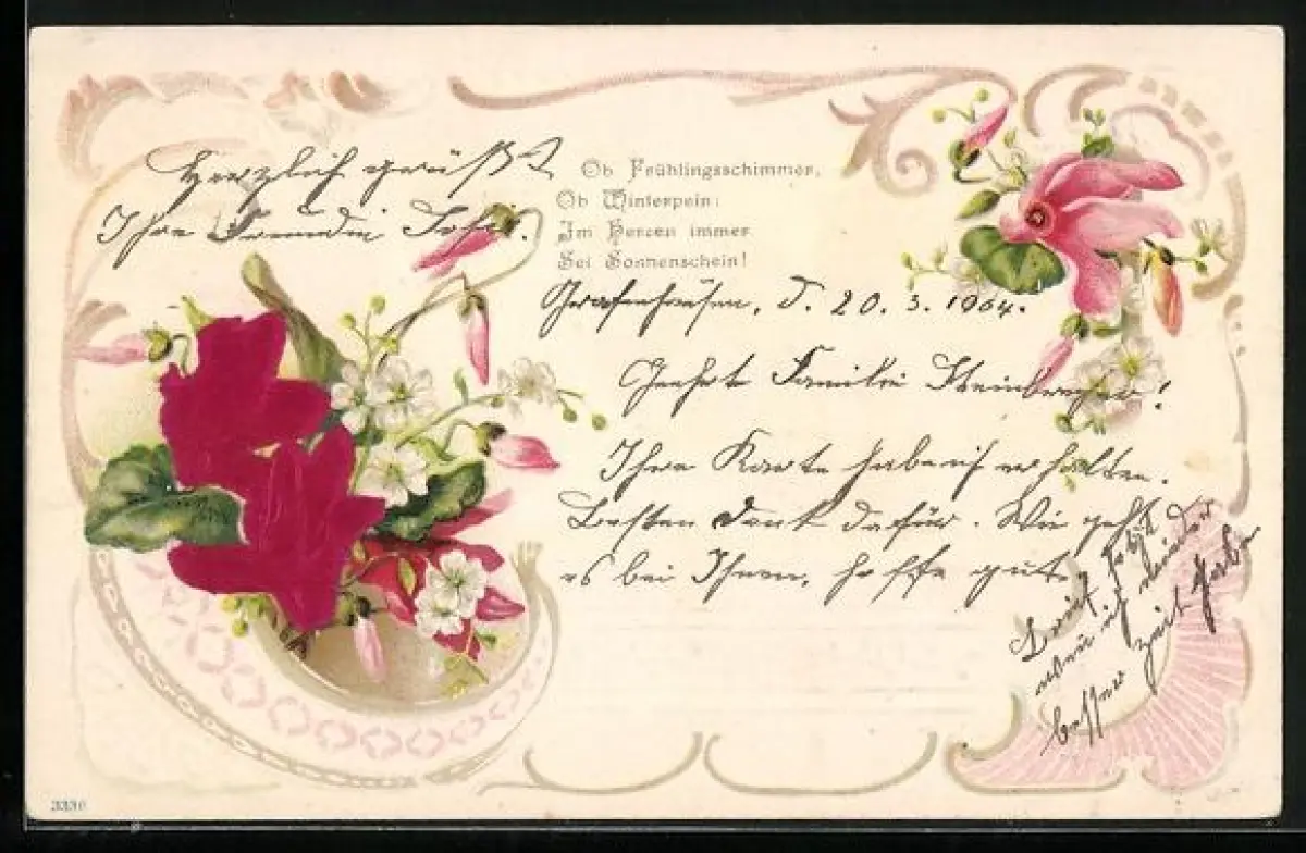 Stoff-Präge-AK Alpenveilchen, geprägter Ornament-Rahmen, Gedicht