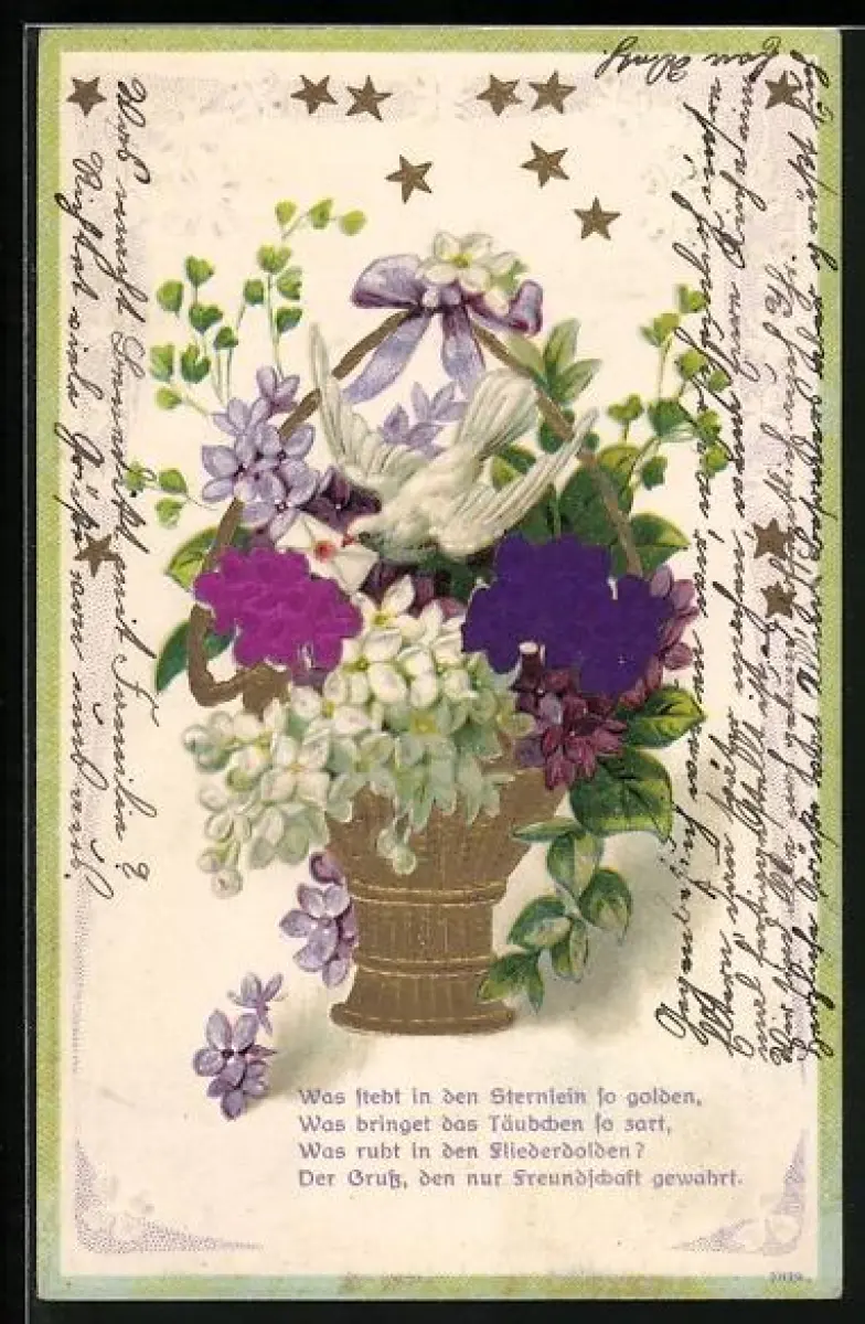Stoff-Präge-AK Blumenkorb mit Taube, die einen Brief im Schnabel hält