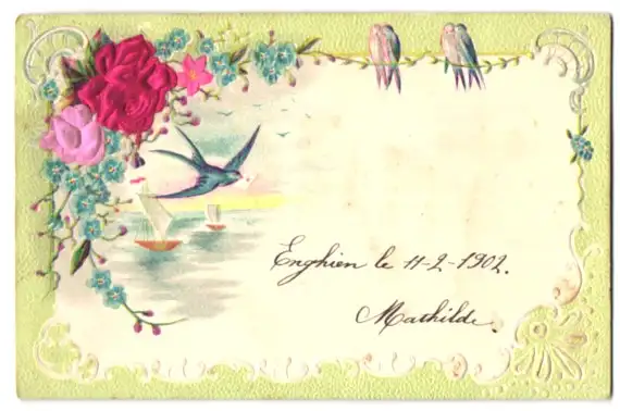 Stoff-Präge-AK Briefschwalbe über Segelbooten, Zweig mit Schwalben, Rosen, Vergissmeinnicht