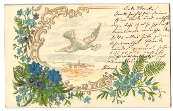 Stoff-Präge-AK Brieftaube über der Stadt, Passepartout mit Blumen aus echtem Stoff