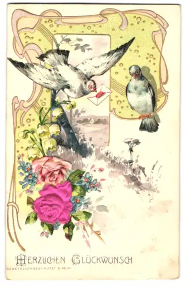 Stoff-Präge-AK Brieftauben, Landschaft, Rosen mit Vergissmeinnicht, Ornamente