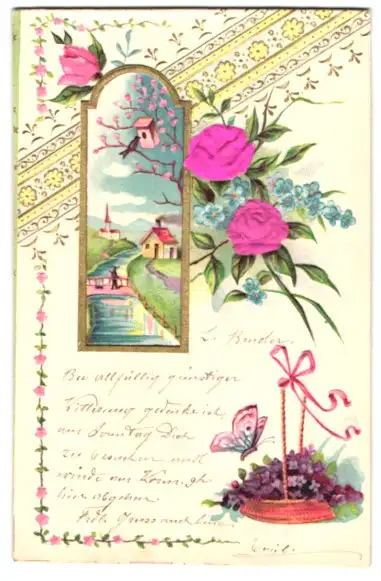 Stoff-Präge-AK Dorfpartie in Passepartout mit geprägten Stoffblumen