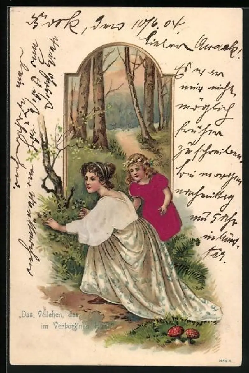 Stoff-Präge-AK Frau und Kind pflücken Blumen im Wald, Das Veilchen, das im Verborg`nen blüht