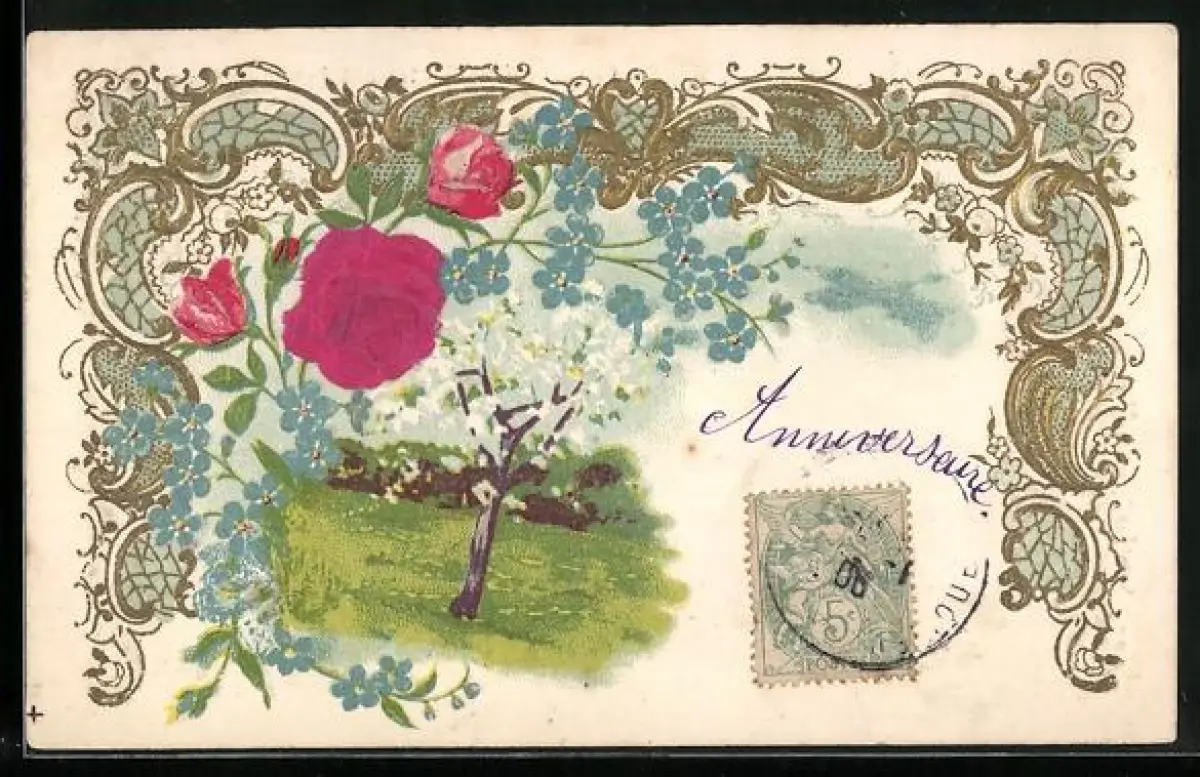 Stoff-Präge-AK Frühlingsidylle, Rosen u. Vergissmeinnicht, geprägter Ornament-Rahmen