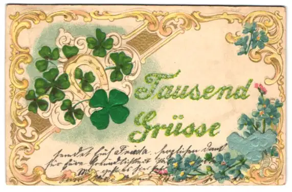 Stoff-Präge-AK Glückskleeblätter und Vergissmeinnicht, eines von jedem aus Stoff