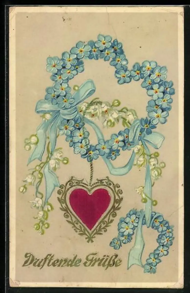 Stoff-Präge-AK Herz aus Blumen mit Herzkette