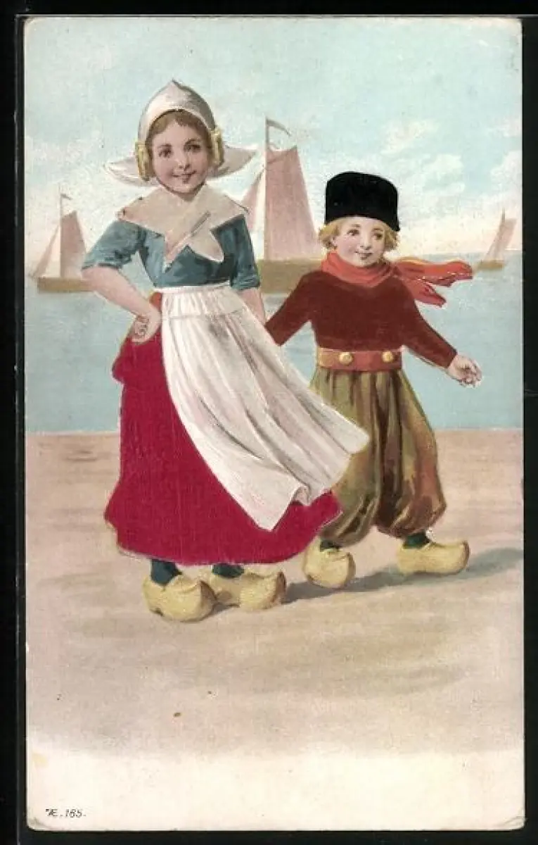 Stoff-Präge-AK Kleines Paar in niederländischer Tracht am Meer