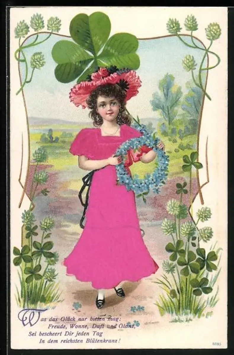 Stoff-Präge-AK Mädchen mit riesigem Kleeblatt und Kranz aus Vergissmeinnicht