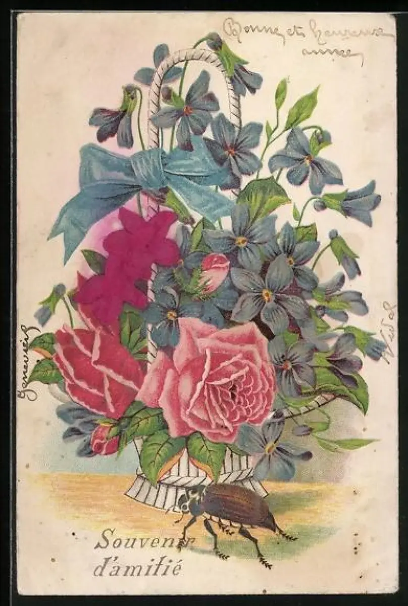 Stoff-Präge-AK Maikäfer mit einem Korb voller bunter Blumen