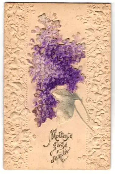 Stoff-Präge-AK Modeste gage d`amitie, Flieder aus Samt