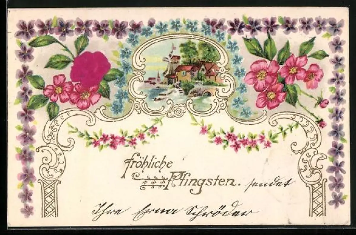 Stoff-Präge-AK Mühle am Fluss mit Vergissmeinnicht und Veilchen, Fröhlicht Pfingsten