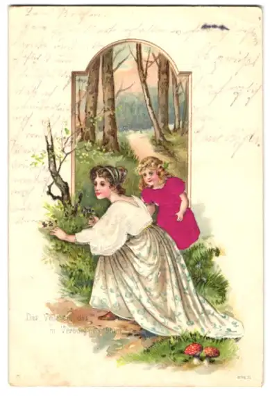 Stoff-Präge-AK Mutter und Kind suchen im Wald nach einem Veilchen