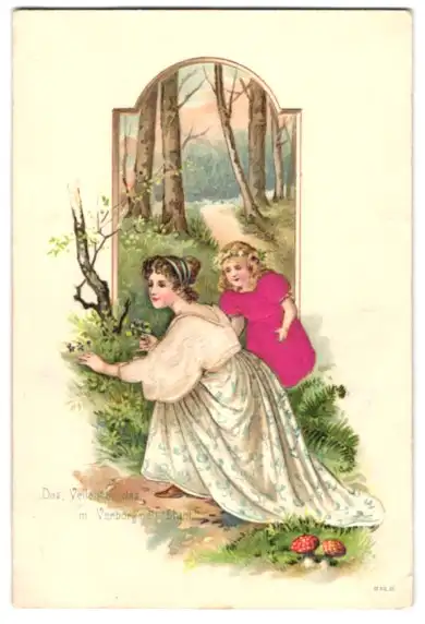Stoff-Präge-AK Mutter und Kind suchen im Wald nach einem Veilchen