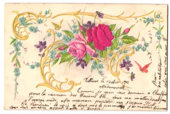 Stoff-Präge-AK Ornament mit Schmetterling und Rosen aus echtem Stoff
