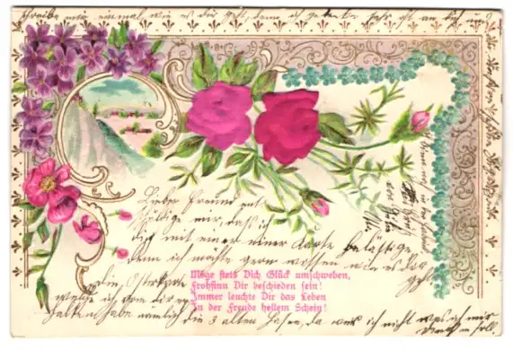 Stoff-Präge-AK Ortsansicht an einem Fluss, Blumen-Passepartout mit zwei Rosen aus echtem Stoff