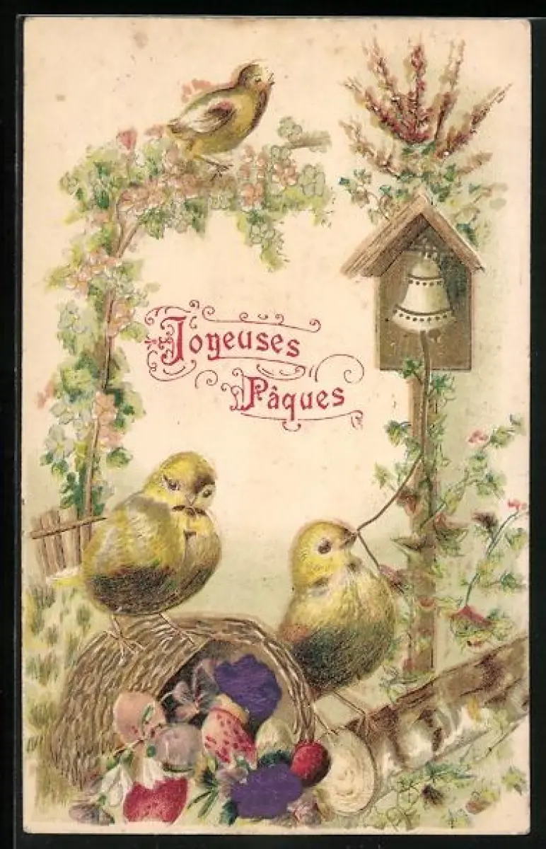 Stoff-Präge-AK Osterküken mit Ostereiern, Joyeuses Paques