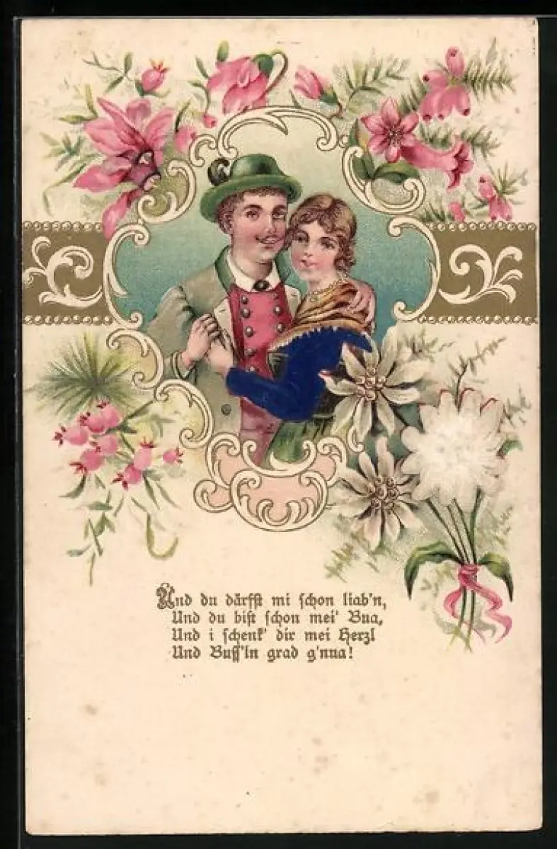 Stoff-Präge-AK Paar in einem Rahmen umgeben von Blumen