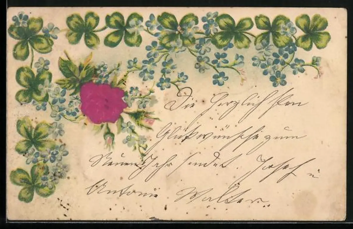 Stoff-Präge-AK Rose u. Vergissmeinnicht mit Glücksklee